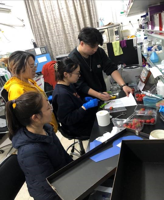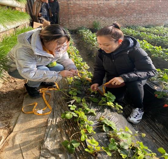 首先确定了取样的草莓大棚,并设计了随机取样方案。同学们在杨老师的带领下迅速的进行距离测量,随机取样的工作。在每个随机取样点我们进行了草莓生长状态的测量,并对草莓的叶片、果实进行了拍照,并采集成熟果实,最后在每个大棚里随机取样草莓整株,以便于后续在实验室的分析工作。