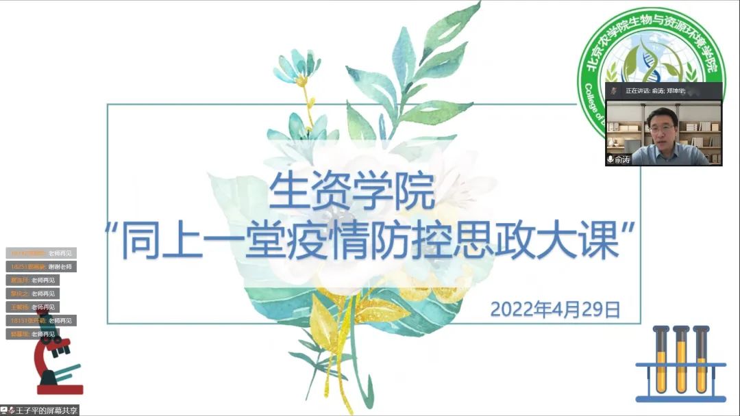 俞涛老师围绕当前国内疫情形势、国家的“动态清零”政策以及我校的疫情防控工作进行讲解,让学生们认识到当前疫情形势的复杂性和严峻性、充分了解国家“动态清零”政策的必要性和科学性、理解学校疫情防控从严从紧的特殊性和重要性,强调做好校园疫情防控工作是每一位北农人的责任,巩固校园疫情防控成果需要全体师生共同努力。