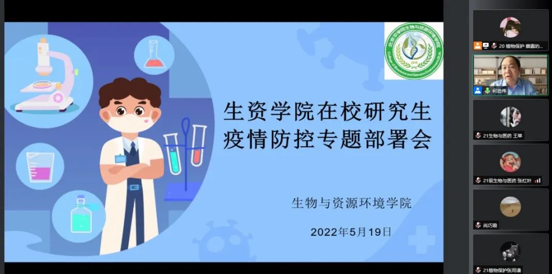 2022年5月19日下午,太阳集团网站8722召开在校研究生疫情防控专题部署线上视频会,传达学校疫情防控工作最新部署和就业工作相关要求,牢固树立疫情防控“红线”和“底线”,守好就业“责任田”,保障校园平安和师生健康,全力做好毕业生就业服务。学校研究生工作部部长何忠伟、学院党总支书记袁中立、科研副院长尚巧霞、研究生辅导员谷薇、全体在校研究生参加了此次会议,会议由学院学生工作副院长俞涛主持。
