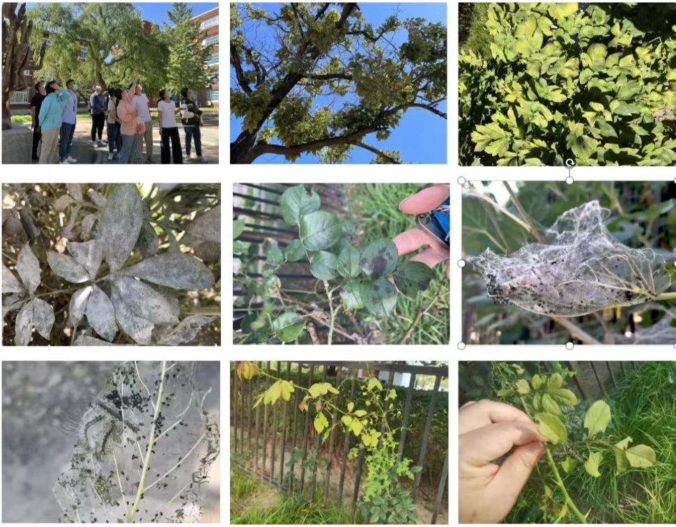 病虫害的发生会导致校园园林景观效果大打折扣。经师生党支部联合调查,发现校园中危害较重的病虫害包括泡桐丛枝病、牡丹病毒病、芍药白粉病、月季黑斑病、美国白蛾、月季切叶蜂及蔷薇三节叶蜂等。今后需加强校园园林有害生物的综合管理,促进植物健康生长,确保园林景观优美。
