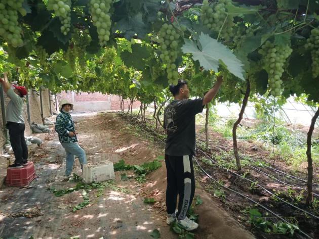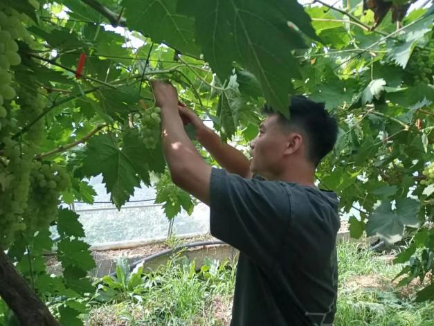 夏天气温较高,光照强烈,作物易出现徒长的现象,这时就需要及时对作物进行摘心。葡萄摘心可以合理调节植株体内营养物质的均匀分配和运输,使养分集中供给有效花果的需要,减少养分消耗,有效提高葡萄的坐果率。7月8日,金粟种植专业合作社刘师傅向小院学生崔武琦和欧梦喆讲解和示范了葡萄摘心的关键点。经过刘师傅耐心教导,小院学生们便开始行动起来。起初俩人的效率并不高,一旁的刘师傅继续指导道“你们别不忍心,就按照我说的方法放心大胆的剪”,经过一段时间的实践,俩人逐渐掌握了葡萄摘心的技术,干得越来越像样。“夏季这些徒长的枝条不仅影响葡萄采光,还浪费营养,你要想尽办法找这些枝条的麻烦,把它剪掉。农业劳动看似简单,其实蕴含着科学原理与自然规律,想要做好还需要实践熟练技术,并理解其中原理。