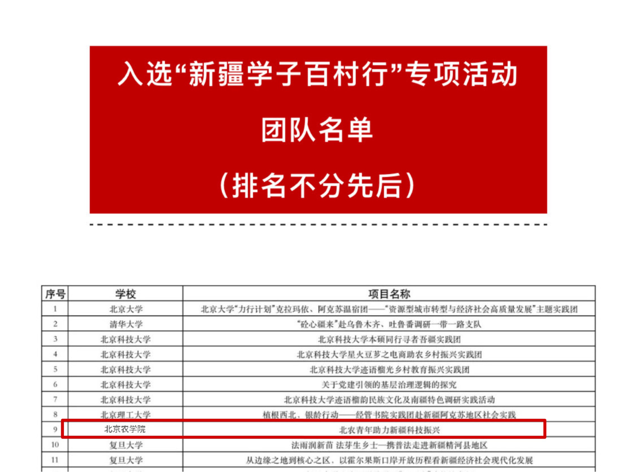 北农青年助力新疆科技振兴实践团从全国高校实践团中脱颖而出,入选新疆维吾尔自治区2023年“新疆学子百村行”专项活动。