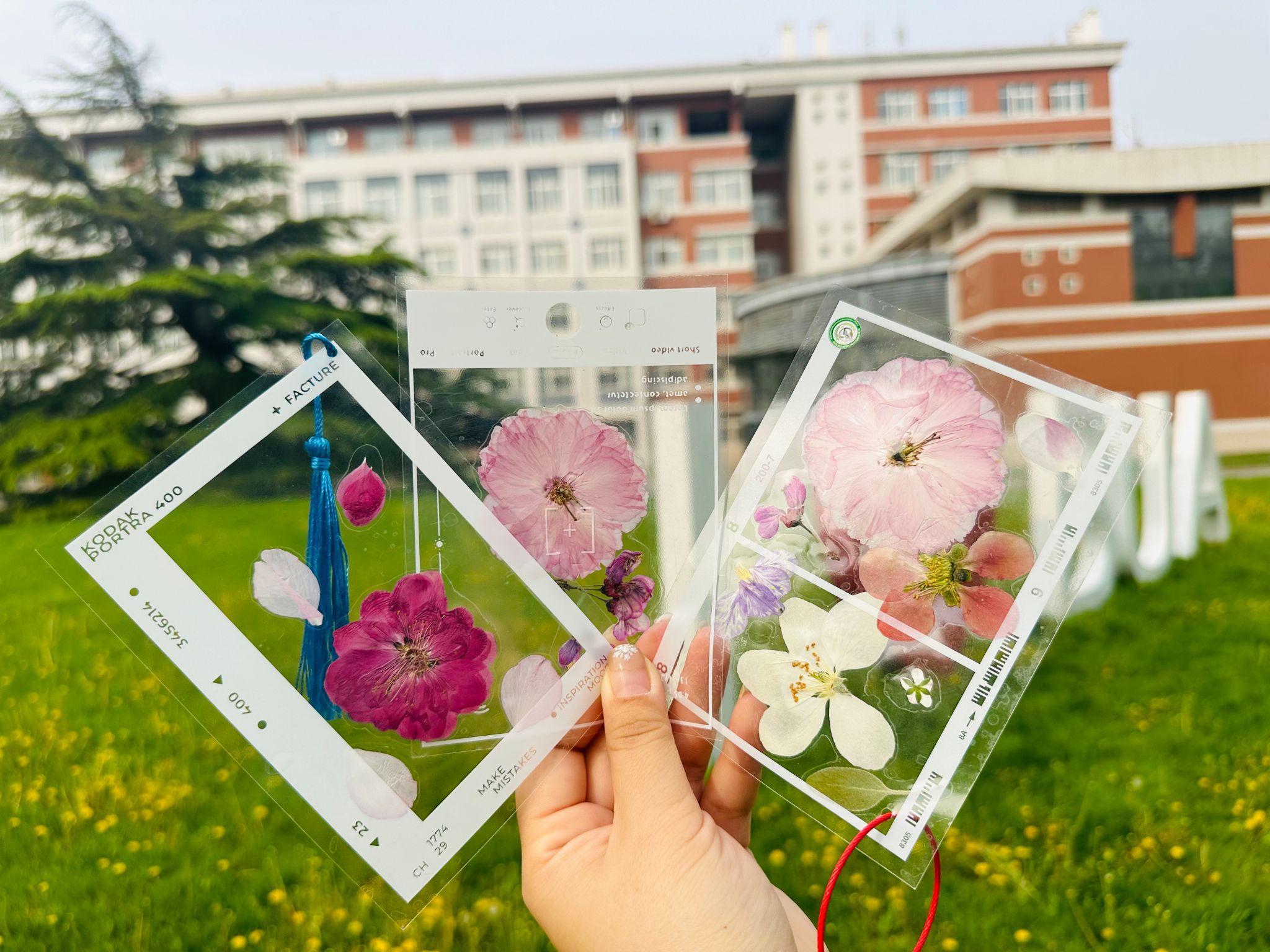春风似剪,春花烂漫。校园春日是明媚而又鲜活着的。行走校园收集片片花瓣,DIY属于自己的春日书签,蘸着浪漫,饱含温情。同学们收集校园内鲜花后制作成标本,形成具有北农特色的书签。同学们充分发挥自己的创意和想象力,整个制作过程充满了欢乐和创意。小小的透明膜布,却承载着同学们满满的心意和无限的期待。