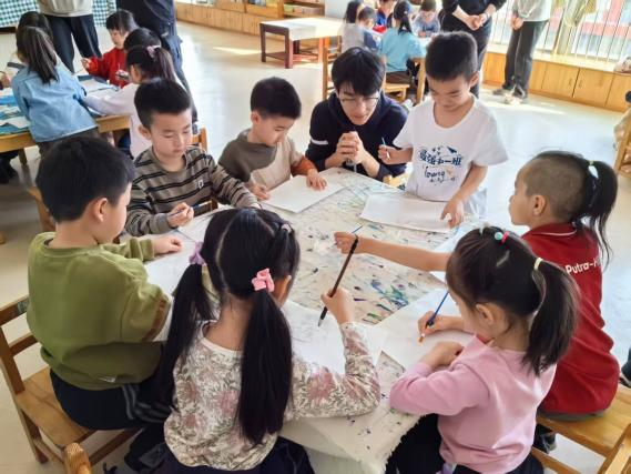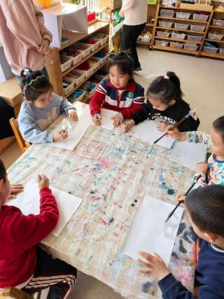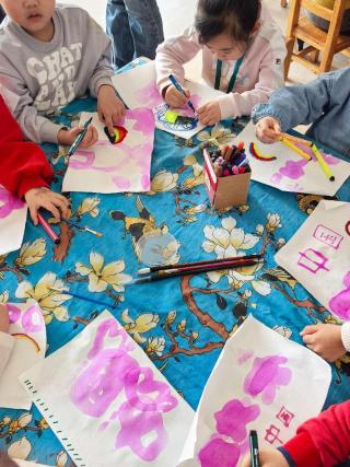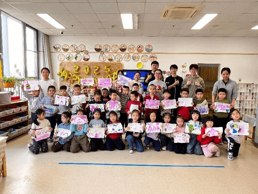 在实验开始前,幼儿园老师引导小朋友们探索身边春天的颜色。小朋友们对春天最常见的颜色进行了讨论,并一致认为是绿色。因此,在“变出春天的颜色”的实验环节中,通过将紫色溶液借助棒棒糖转变为绿色的溶液,这一过程不仅利用了小朋友们熟悉且喜爱的物品作为道具,还成功吸引了他们的注意力,并进一步激发他们去发现生活中的美。而在“小小化学家”环节中,小朋友们使用酚酞进行绘画,待画作干燥后,由五位应化系同学协助喷洒碱溶液,从而在纸上显现出画像。小朋友们对此表现出极大的兴趣,积极分享自己的成果,并感叹道:“这个魔术太神奇啦!”