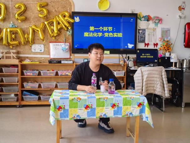 活动现场设置了“魔法化学——变色实验”“变出春天的颜色”以及“小小化学家”三个环节。五位应化系的同学以生动的语言和趣味十足的实验为小朋友们呈现了一场“魔术秀”,展示了化学的魅力,教师则进一步为小朋友们揭示了这些魔术背后的科学原理。其中,“魔法化学——变色实验”是通过氧化还原反应,从紫色的高锰酸钾溶液转变为类似牛奶的颜色,这一显著的现象极大地激发了小朋友们的好奇心。同时,借此机会,活动还向小朋友们传递了健康饮食的理念,鼓励他们多喝牛奶,减少饮用含糖饮料的次数。