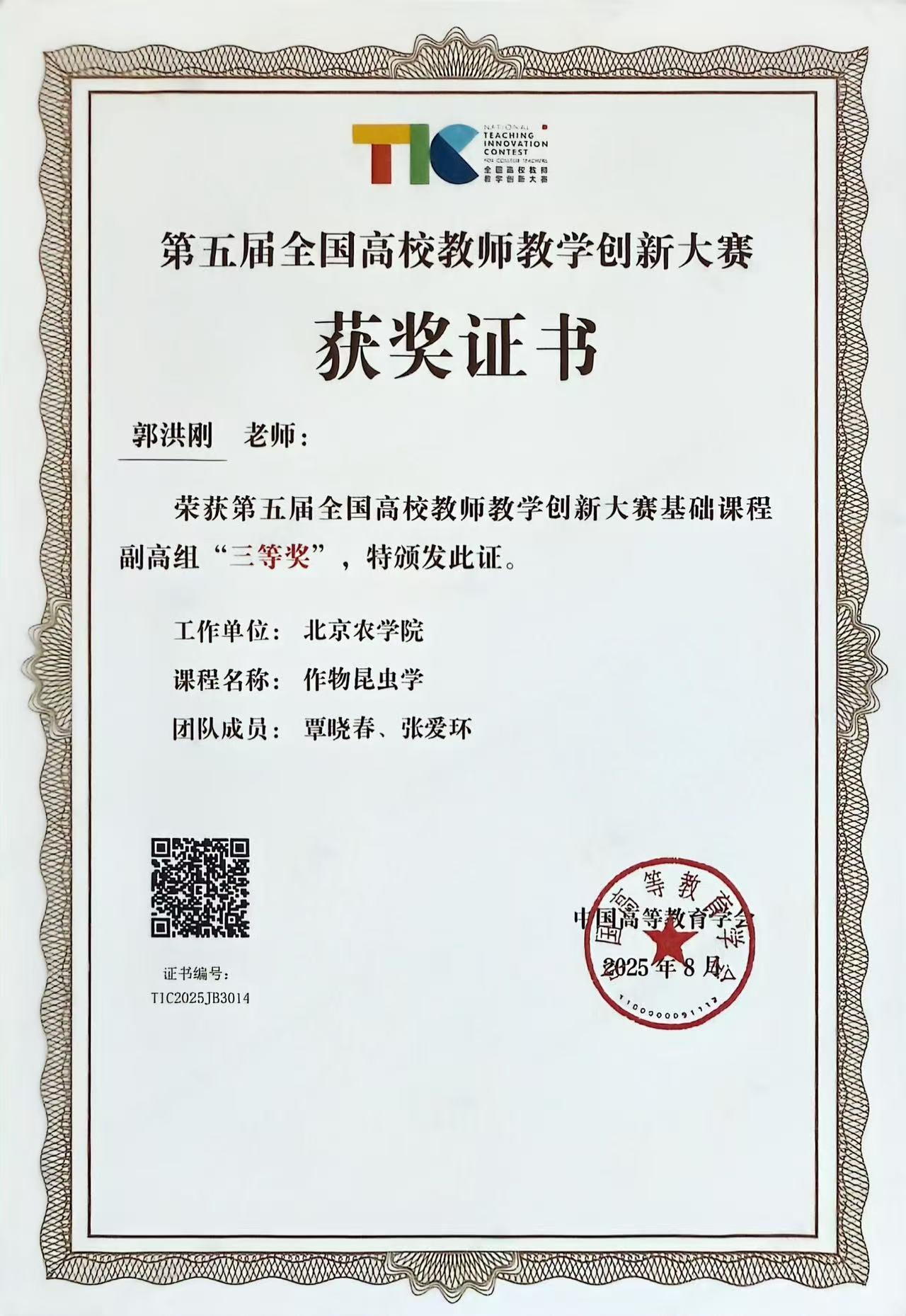8月19日,由教育部高等教育司指导,中国高等教育学会主办的第五届全国高校教师教学创新大赛总结大会在北京理工大学举行。太阳集团植保系教师郭洪刚带领的《作物昆虫学》课程团队(成员:覃晓春、张爱环)荣获基础课程副高组三等奖。