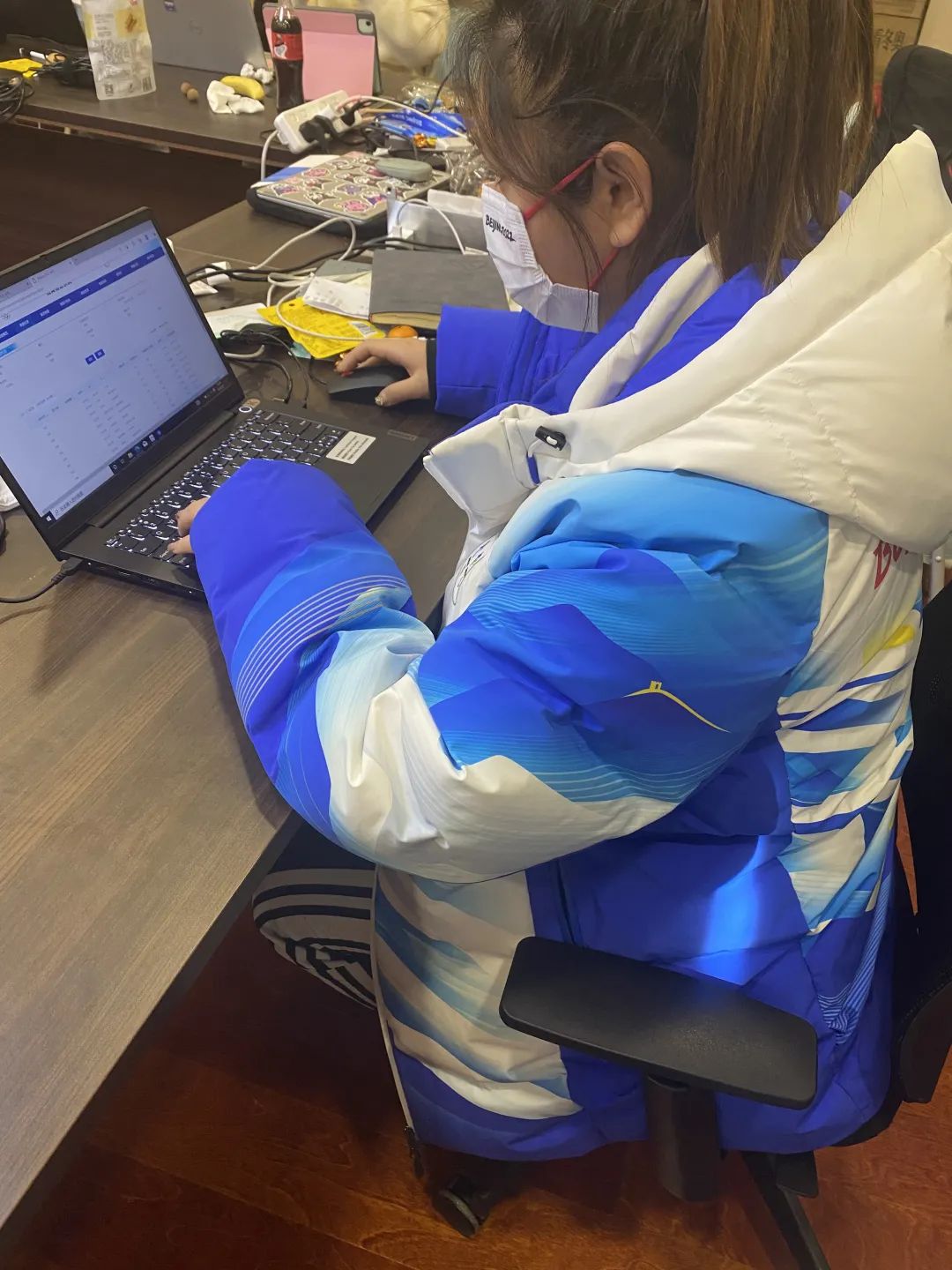徐佳伊:北京冬奥组委给我们每一位志愿者都配备了丰富的物资,其中包括志愿者服装、自热饭、华夫饼还有我最喜欢的冰墩墩等纪念品,衣食住行每一项都能仔细地照顾到。我能感受到冬奥组委和学校的用心,让我在这寒冷的冬天感受到无比的温暖。