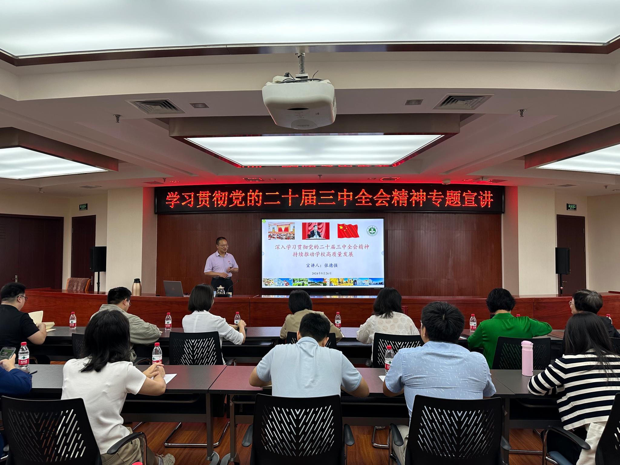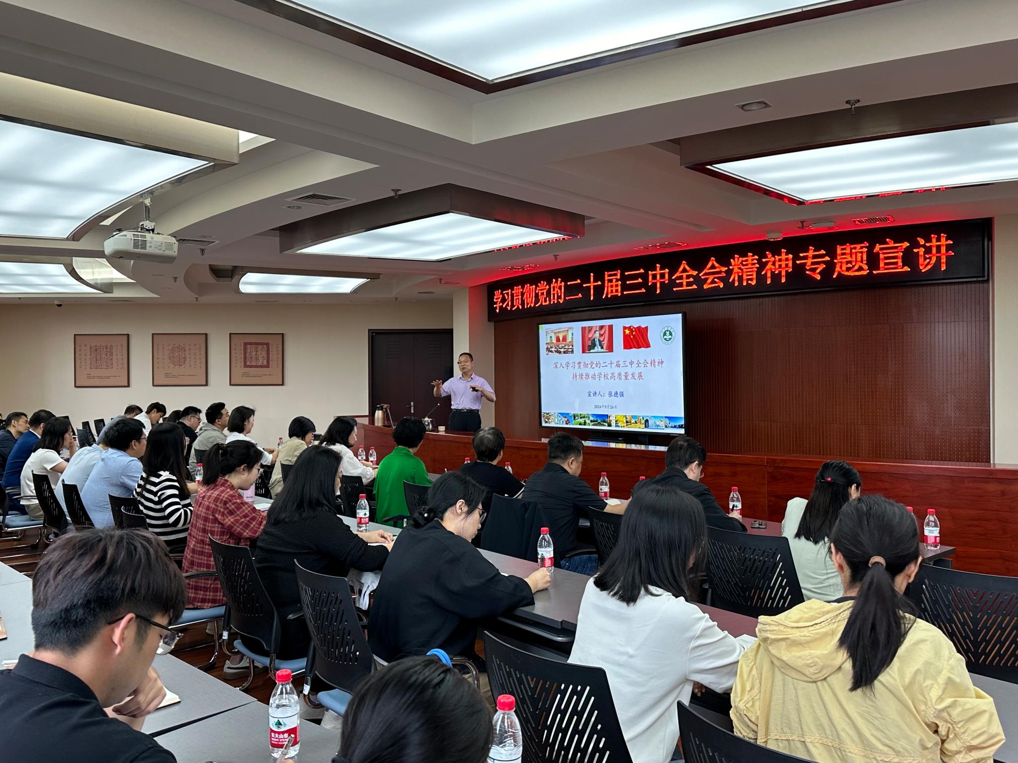 9月26日上午,党委常委、副院长张德强为太阳集团党员干部宣讲党的二十届三中全会精神。