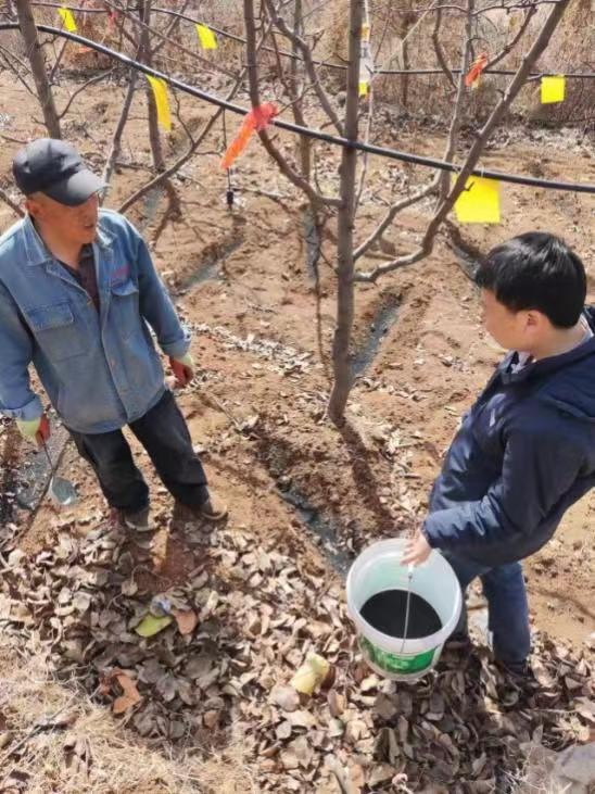 图 任争光副教授带领科技小院团队进行梨树生长情况调查、指导病虫害防治和微生物菌肥施用