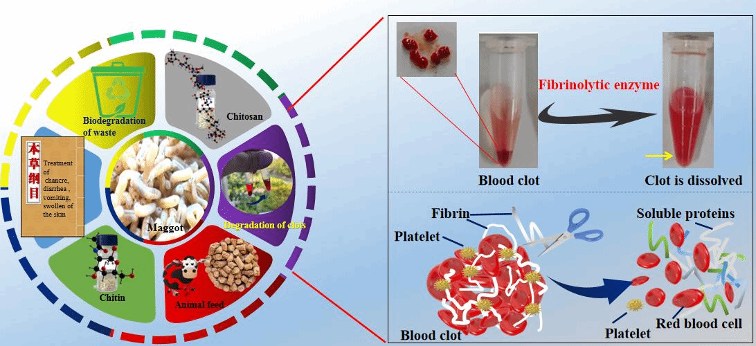 溶栓酶是一类具有溶解血栓功能的蛋白酶分子,在临床上作为药物应用于血管栓塞性疾病。天然资源是获取溶栓蛋白的重要宝库,源自天然产物的尿激酶、蚓激酶、链激酶等溶栓酶已广泛应用于血管栓塞性疾病的临床治疗。蝇蛆是《本草纲目》记载的传统中药,具有易生长、成本低廉的特点。蛆激酶是从蝇蛆中发现的高活性溶栓酶,太阳集团tcy8722天然产物团队2021年首次从蝇蛆中发现并分离获得该溶栓酶,命名蛆激酶,实现蝇蛆变废为宝,改变了人们对蝇蛆的传统认识。近期,天然产物团队在蛆激酶结构和催化机制方面取得新进展,发表了题为“Maggot kinase: A novel and cost-effective fibrinolytic enzyme form maggot”的科研论文,相关研究结果近期发表于生物大分子领域国际知名期刊 International Journal of Biological Macromolecules (中科院1区,top期刊)。