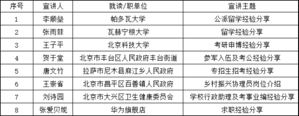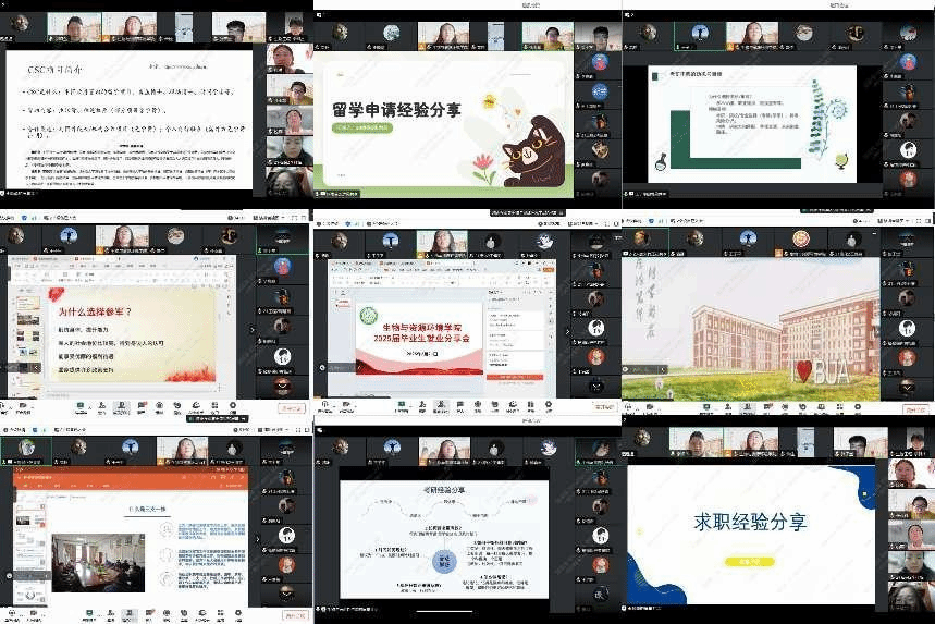 学院根据前期毕业生问卷调研结果,分析毕业生就业需求,分6模块邀请8位优秀校友,分别从出国留学、考研考博、考公考编、参军入伍、乡村振兴协理员、求职就业等方面进行就业宣讲,分享会涵盖学院2025届本研全体毕业生,同时邀请毕业生家长参会,使毕业生家长与学院就业工作同频共振。